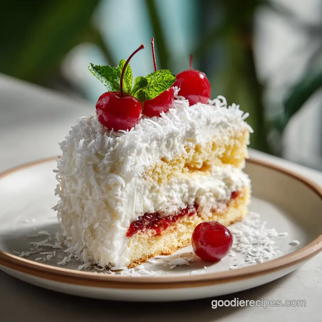 It refers to a specific white chocolate coconut bundt cake. This version is famous for its dense texture and chocolate shavings, whereas this recipe focuses on a light, airy layer cake with cream cheese frosting.